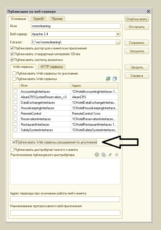 Заполняем имя публикации, выбираем каталог где будет храниться публикация и ставим галочку публиковать веб-сервисы расширений по умолчанию.